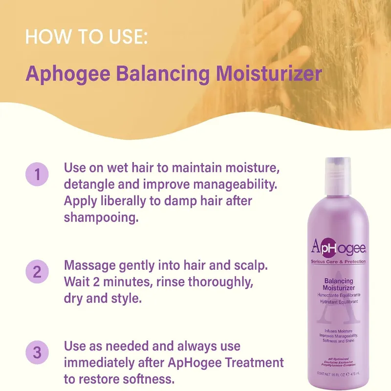 ApHogee Balancing Moisturizer is a hydrating conditioner formulated with a unique Pro- phytamine complex of vitamins, collagen and amino acids to lock in moisture and restore balance to the hair.