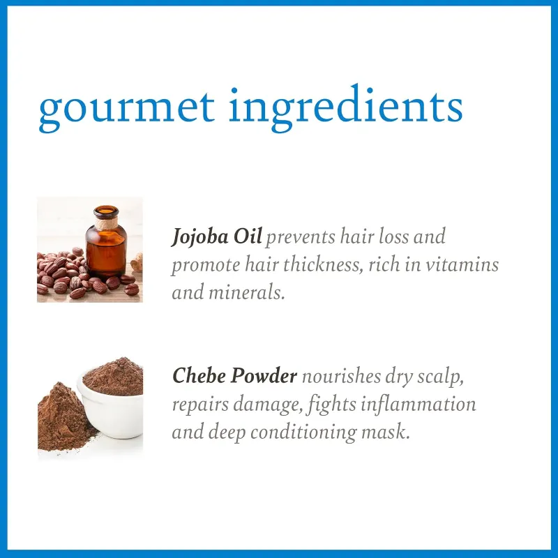 Deionized Water (Aqua), Cetearyl Alcohol, Cocos Nucifera (Coconut) Oil, Glycerin, Cyclopentasiloxane, Simmondsia Chinensis (Jojoba) Seed Oil, Stearamidopropyl Dimethylamine (Plant Derived), Behentrimonium Chloride (Plant Derived)Behentrimonium Methosulfate(PlantDerived),Cyclotetrasiloxane, Dimethiconol, Ricinus Communis (Black Castor) Seed Oil, Croton Zambesicus (Chebe) Powder, Hydrolyzed Wheat Protein, Guar Hydroxypropyltrimonium Chloride, Phenoxyethanol (Optiphen ND), Ethylhexylglycerin, Citric Acid, and Phthalate-Free Fragrance