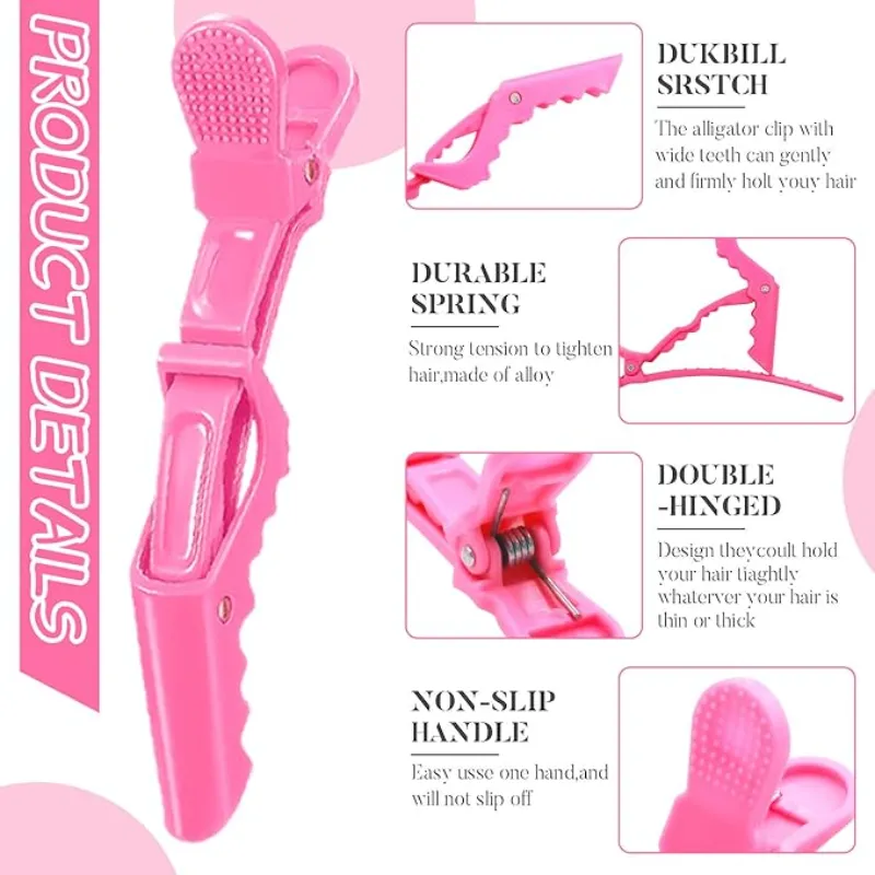 Crocodile Hair Clips are small, spring-loaded hair accessories shaped like a crocodile’s open jaw with interlocking teeth. They have a hinged design with serrated grips that securely hold sections of hair in place without slipping. Typically made from metal, plastic, or a combination of both, these clips are lightweight, easy to use, and popular in both everyday styling and professional hairdressing for sectioning, pinning back, and organizing hair during cutting, drying, or heat styling. Their strong grip and simple mechanism make them ideal for managing hair in precise sections.