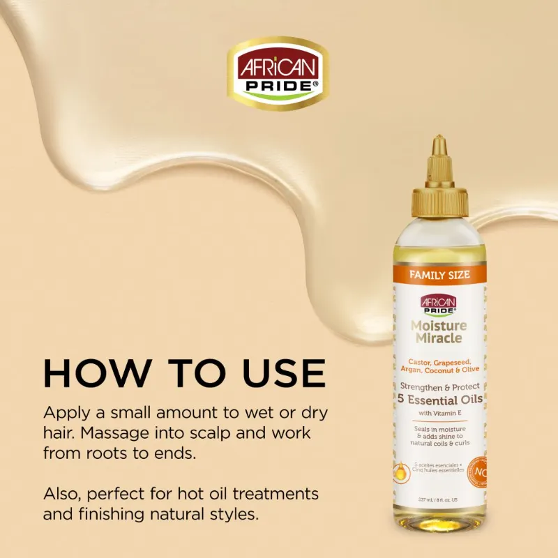 African Pride Moisture Miracle 5 Essential Hair Oils uses a nourishing blend of 5 essential oils and Vitamin E to replenish natural nutrients, help protect against breakage and promote natural growth; leaving coils and curls with body and shine.