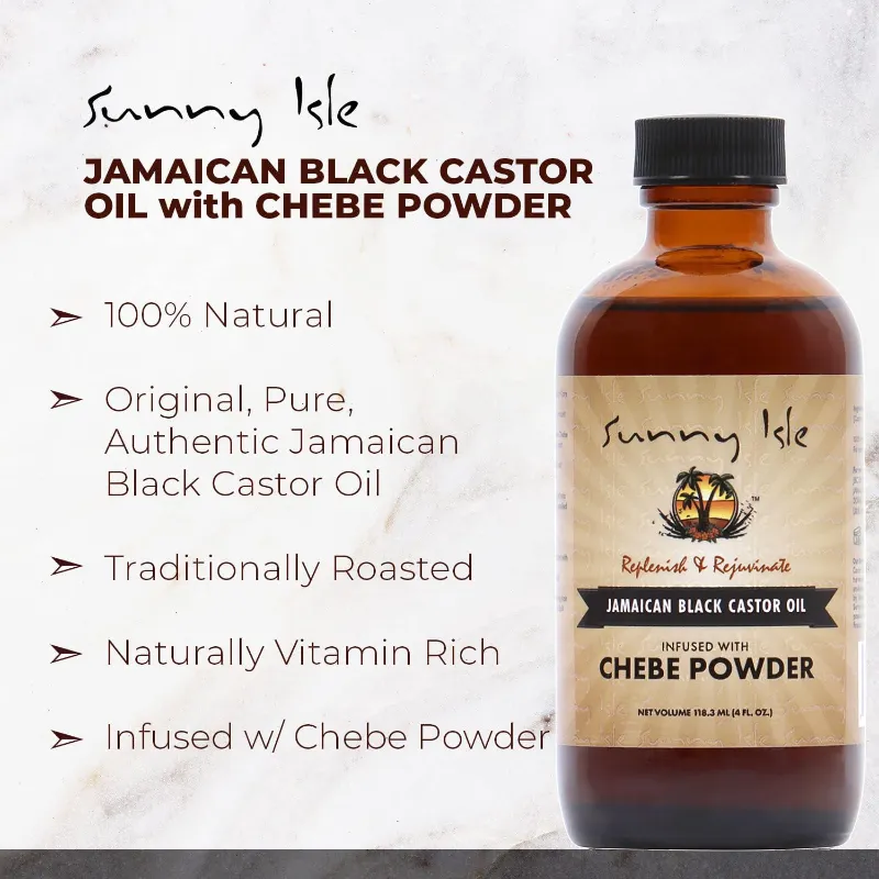 Sunny Isle Jamaican Black Castor Oil infused with Chebe Powder is formulated to effectively treat and strengthen every strand of hair from root to tip, and restore shine to dull hair. Moisture retention, balances scalp PH, alleviates symptoms associated with eczema and psoriasis. 100% Natural.