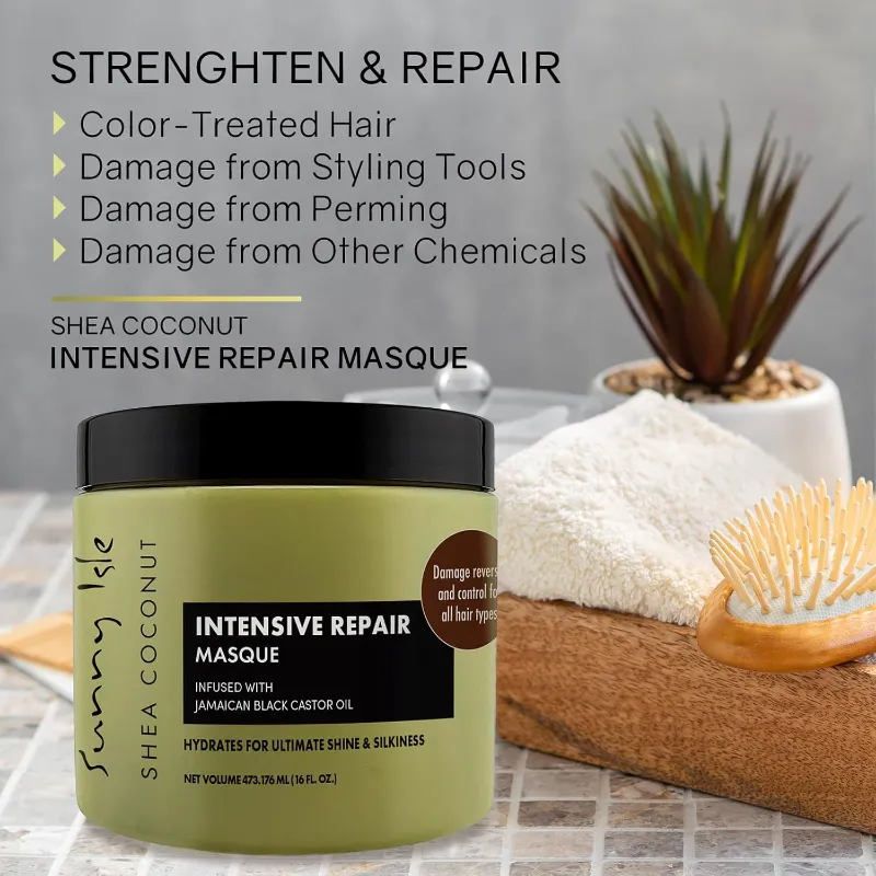Sunny Isle Shea Coconut Intensive Repair Masque provides damage control for all hair types!. This rich and creamy blend of Shea butter, Jamaican Black Castor Oil & Coconut Oil, helps repair damage caused by heat from styling tools, coloring, perming and other chemicals. Shea Butter absorbs quickly in hair folicles to rehydrate dry scalp and prevents damage. Coconut Oil strengthens hair, increases manageability, and adds body & shine. Jamaican Black Castor Oil promotes healthy hair growth while nourishing dry scalps.