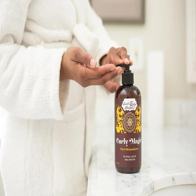 Uncle Funkys Daughter Curly Magic Curl Stimulator delivers superior results of taming frizz, elongating curls, and adding moisture all in one powerful product. Achieve a wash and go look, wear two-strand twists, twist outs, comb twists, finger twists and starter locs. For best results, use with Squeaky Deep Cleanser, Richee Rich Moisturizer, and Thirsty Curls Revitalizer for the next day.